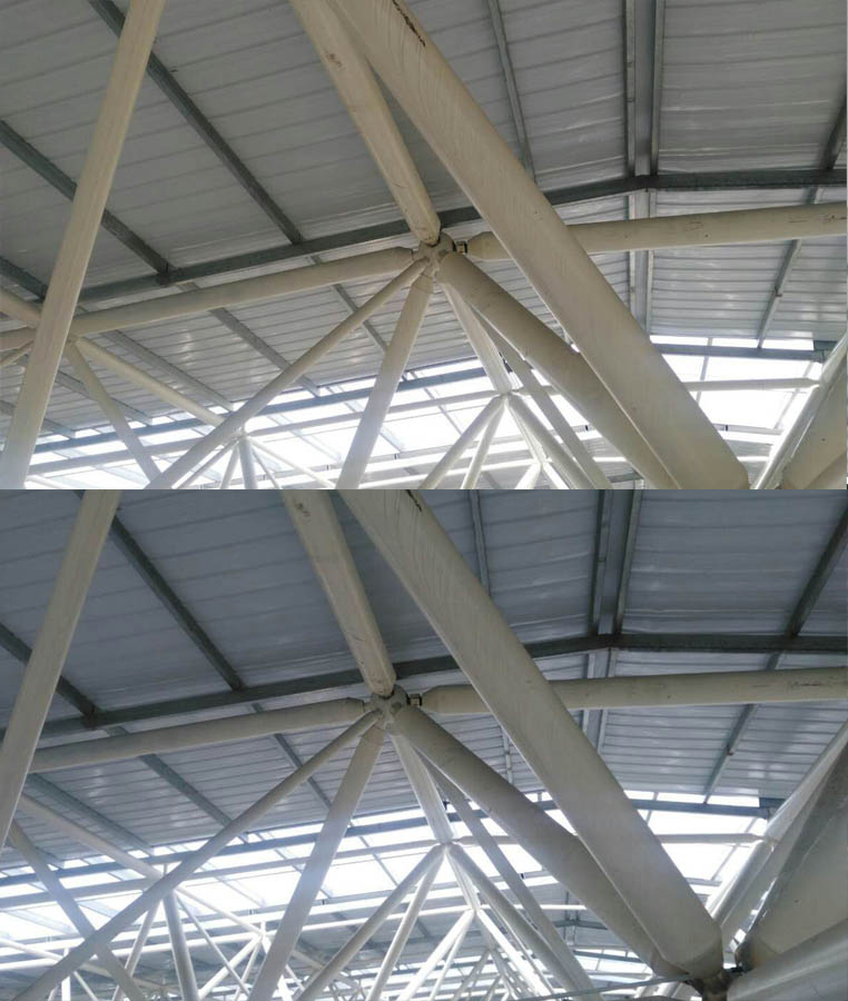 关于网架维修问题,安装后出现网架高强螺套筒松动的解决方案,首选判断这是非网架专业人员安装后造成的螺栓套筒未紧原因,产生的原因是因为网架施工人员并未经过专业培训,而是照本宣科,自认为拧紧套筒后造成的。(事后了解是施工方为了节省安装费用,在劳务市场雇佣了劳务人员进行的操作),也许施工现场并未能及时发现问题,但在使用一段时间后出现松动,这是非常危险的。从以下图可以看出,在屋面板已安装完毕后,投入使用后不到一个月就发现了问题,出现了套筒松动,支座锈蚀,杆件损伤、、、以上问题出现后会严重影响到网架设计的承载,改变了受力结构,极易造成隐患事故。针对以上出现的问题,我公司认为应立即停止使用,全面检修。进行网架各部件之间全部要仔细检查一遍,针对性进行修复,严重的还要重新拆散重新安装,重新补漆。